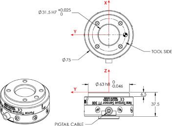 The coordinate system used for calculating the moment of inertia and center of mass for the FT Sensor is shown in the figure below.